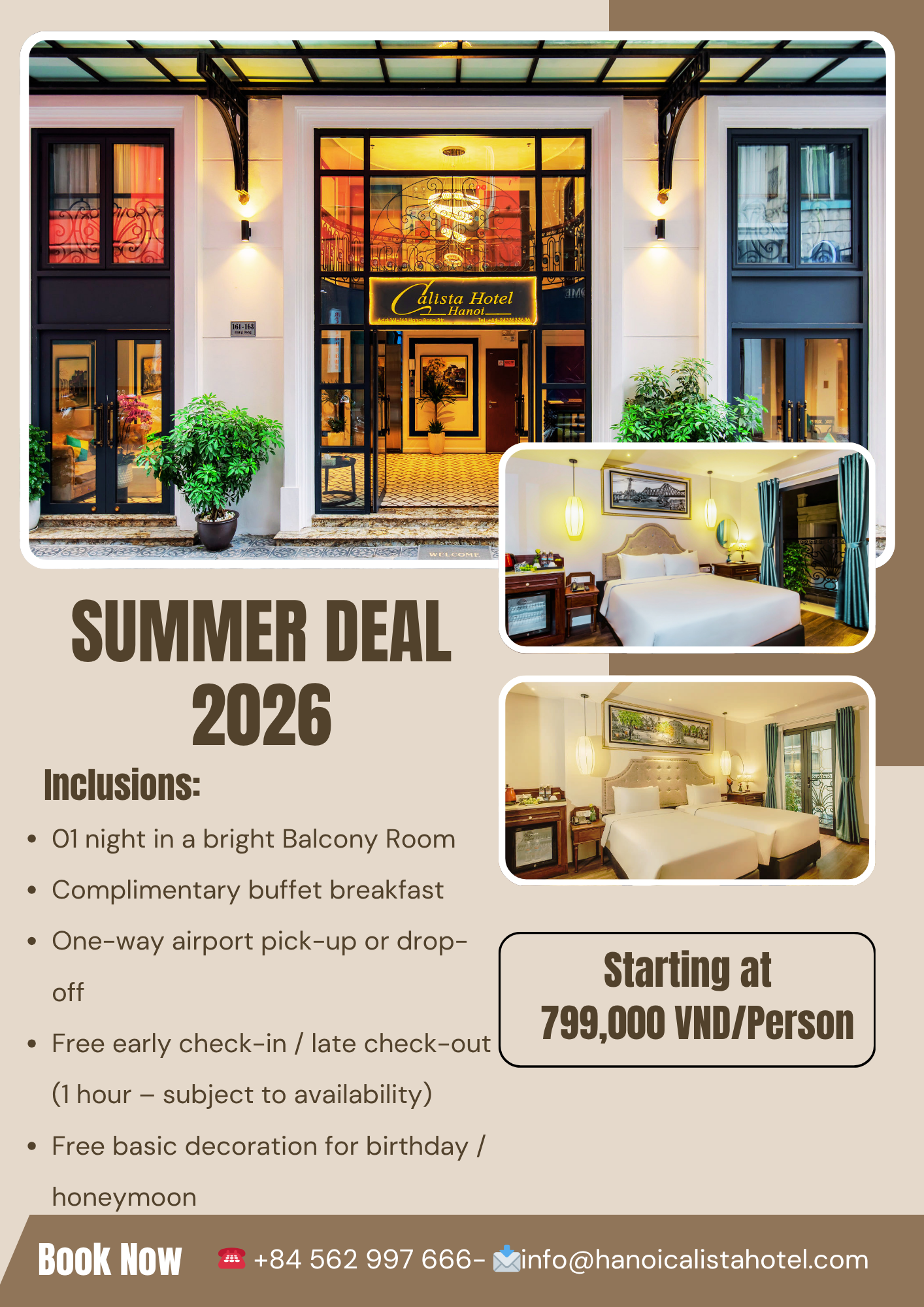 Hanoi Calista Hotel & Spa- a luxury four-star hotel located on Hang Bong Street (Hoi Vu Lane) - a romantic street in Hanoi's Old Quarter. The harmonious blend of color gamut brings sophistication and elegance at first sight when customers arrive at the hotel. With almost 6 room types are well equipped and modern decorations with individually controlled air conditioning, plush and comfortable en-suite bathrooms with lots of toiletries and amenities, large flat-screen cable TVs with international channels, and clever lighting arrangements that bring out the cozy aspect of the room.